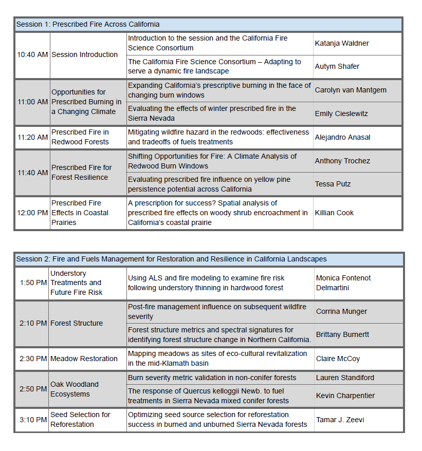 This special session highlights student-led research in fire and fuels management across California’s landscapes, with a focus on actionable solutions for decision-makers. The session is divided into two themes: Session 1, Prescribed Fire Across California, and Session 2, Fire and Fuels Management for Restoration and Resilience. Presentations will cover topics such as forest resilience, post-fire reforestation, prescribed burning windows, and more.