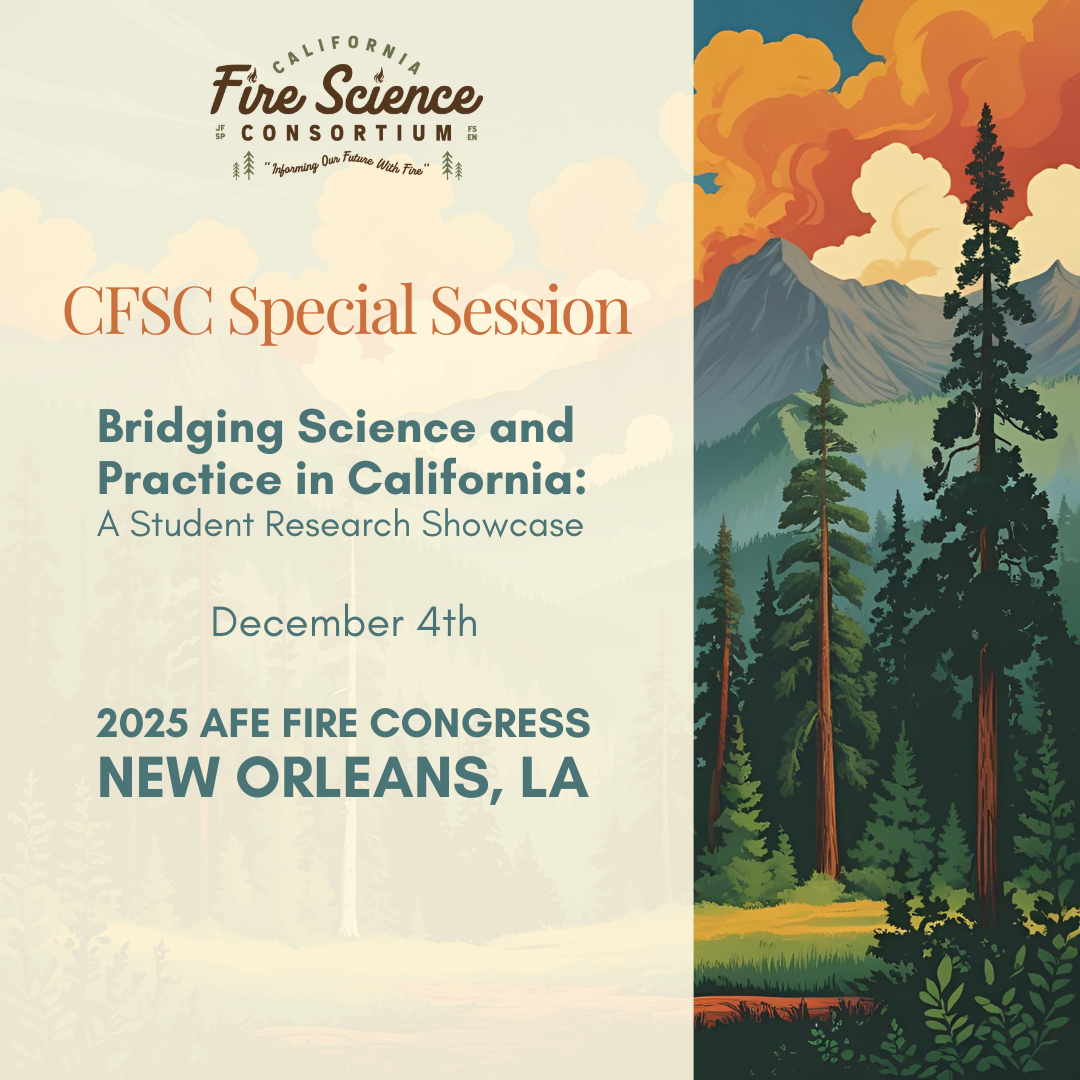 The California Fire Science Consortium (CFSC) strives to accelerate the awareness, understanding, and adoption of fire science information by decision-makers across the region. Applying research to land management decisions can be challenging due to limited actionable findings, information overload, researcher-practitioner disconnects, and findings that don’t always align with local conditions. Meanwhile, students are addressing these barriers by producing innovative research, yet face limited platforms to share their work with land managers, decision-makers, and the broader research community.
