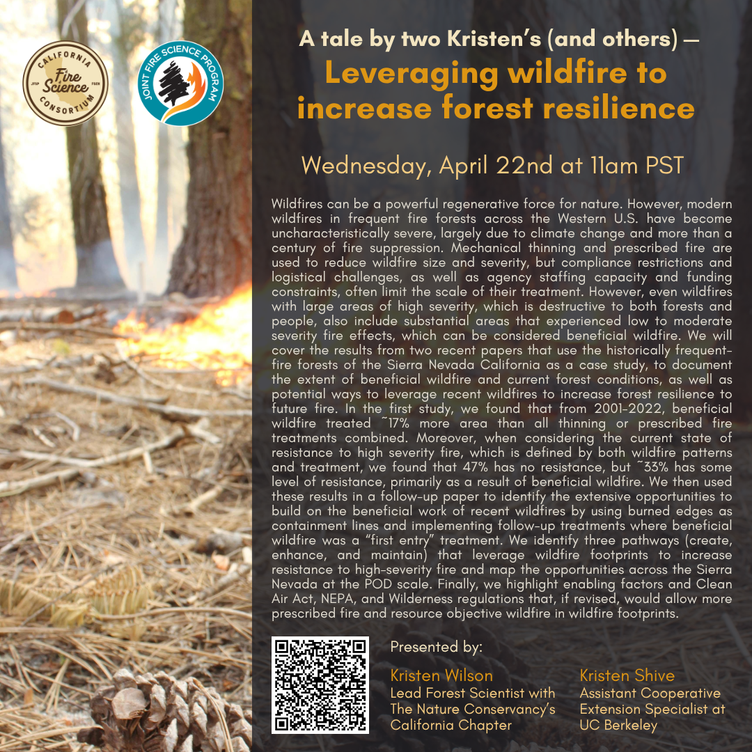 Abstract: Wildfires can be a powerful regenerative force for nature. However, modern wildfires in frequent fire forests across the Western U.S. have become uncharacteristically severe, largely due to climate change and more than a century of fire suppression. Mechanical thinning and prescribed fire are used to reduce wildfire size and severity, but compliance restrictions and logistical challenges, as well as agency staffing capacity and funding constraints, often limit the scale of their treatment. However, even wildfires with large areas of high severity, which is destructive to both forests and people, also include substantial areas that experienced low to moderate severity fire effects, which can be considered beneficial wildfire. We will cover the results from two recent papers that use the historically frequent-fire forests of the Sierra Nevada California as a case study, to document the extent of beneficial wildfire and current forest conditions, as well as potential ways to leverage recent wildfires to increase forest resilience to future fire. In the first study, we found that from 2001-2022, beneficial wildfire treated ~17% more area than all thinning or prescribed fire treatments combined. Moreover, when considering the current state of resistance to high severity fire, which is defined by both wildfire patterns and treatment, we found that 47% has no resistance, but ~33% has some level of resistance, primarily as a result of beneficial wildfire. We then used these results in a follow-up paper to identify the extensive opportunities to build on the beneficial work of recent wildfires by using burned edges as containment lines and implementing follow-up treatments where beneficial wildfire was a “first entry” treatment. We identify three pathways (create, enhance, and maintain) that leverage wildfire footprints to increase resistance to high-severity fire and map the opportunities across the Sierra Nevada at the POD scale. Finally, we highlight enabling factors and Clean Air Act, NEPA, and Wilderness regulations that, if revised, would allow more prescribed fire and resource objective wildfire in wildfire footprints.