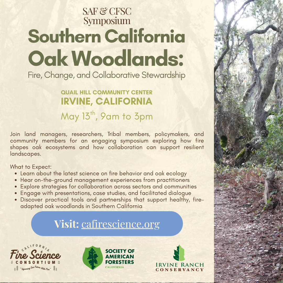 The California Fire Science Coalition and the Society of American Foresters invite you to join us for Southern California Oak Woodlands: Fire, Change, and Collaborative Stewardship on May 13, 2026 at Quail Hill Community Center in Irvine, CA from 9 - 3 PM.